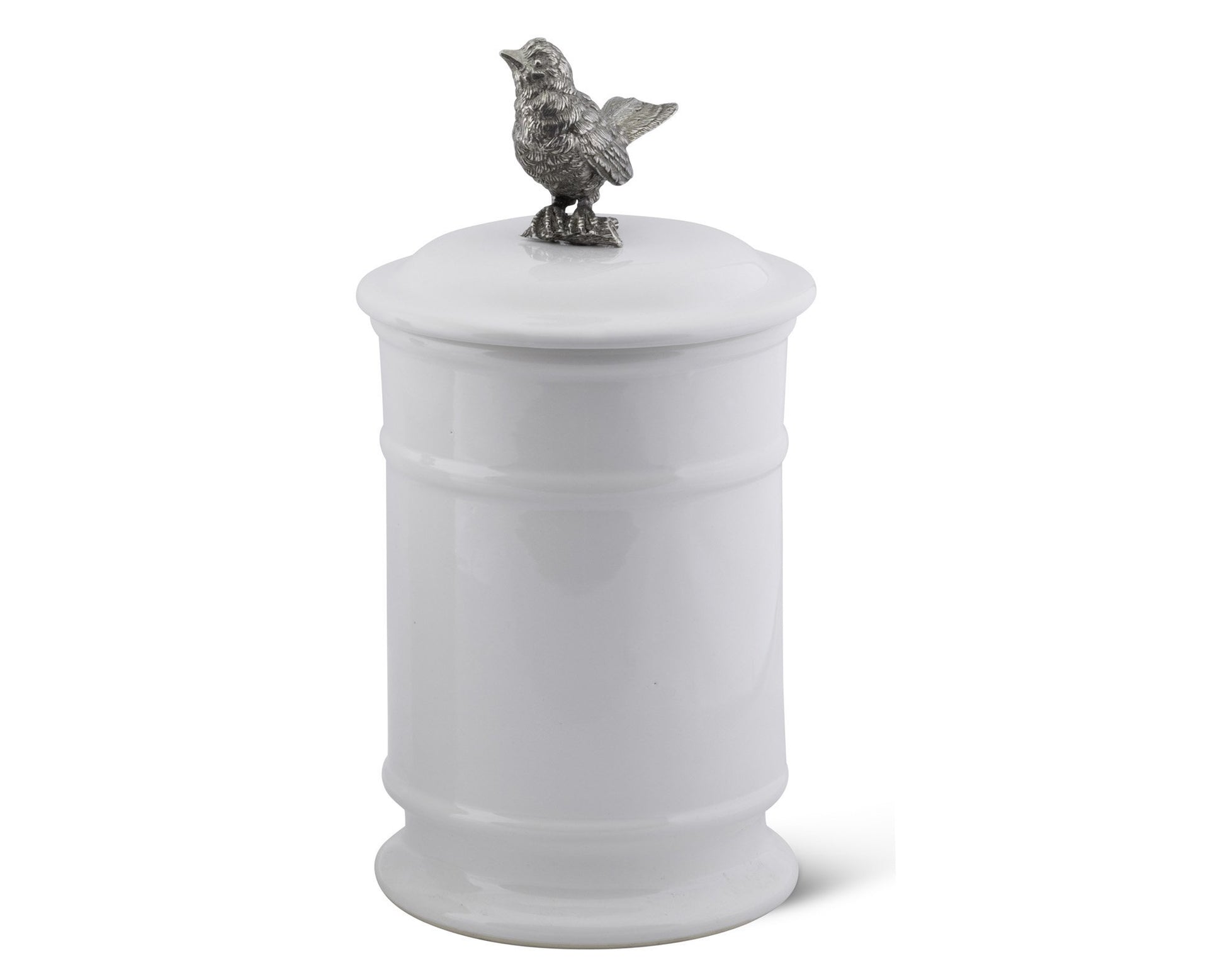 A mini-statue of our signature Song Bird in pure pewter tops Vagabond House's Song Bird Canisters. The saucy little singer makes a handy handle atop our lustrous, double-glazed, twice fired fine stoneware canisters. Available in 2 sizes.