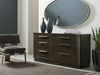 Classic Streamline-era details come to life in this contemporized six-drawer dresser. Distinguished by its generously rounded corners, and recessed plinth base, this piece takes on a refreshed style in fumed figured eucalyptus that has been finished in Aged Bourbon with a high sheen. The soft-closing drawers are lined in Dark Chocolate paint. One drawer has a jewelry tray. Each generously sized drawer has long, thin custom Golden Bronze metal pulls.