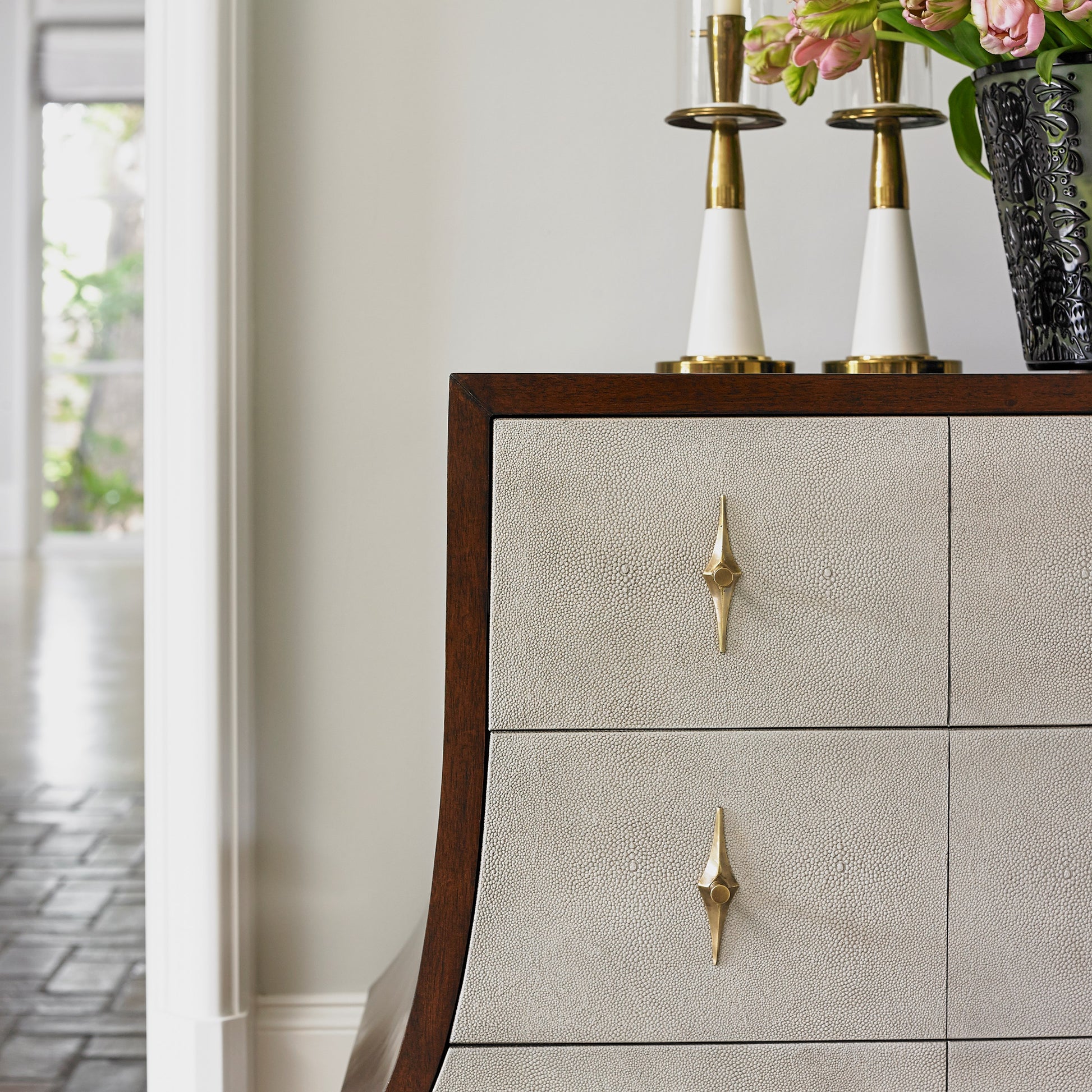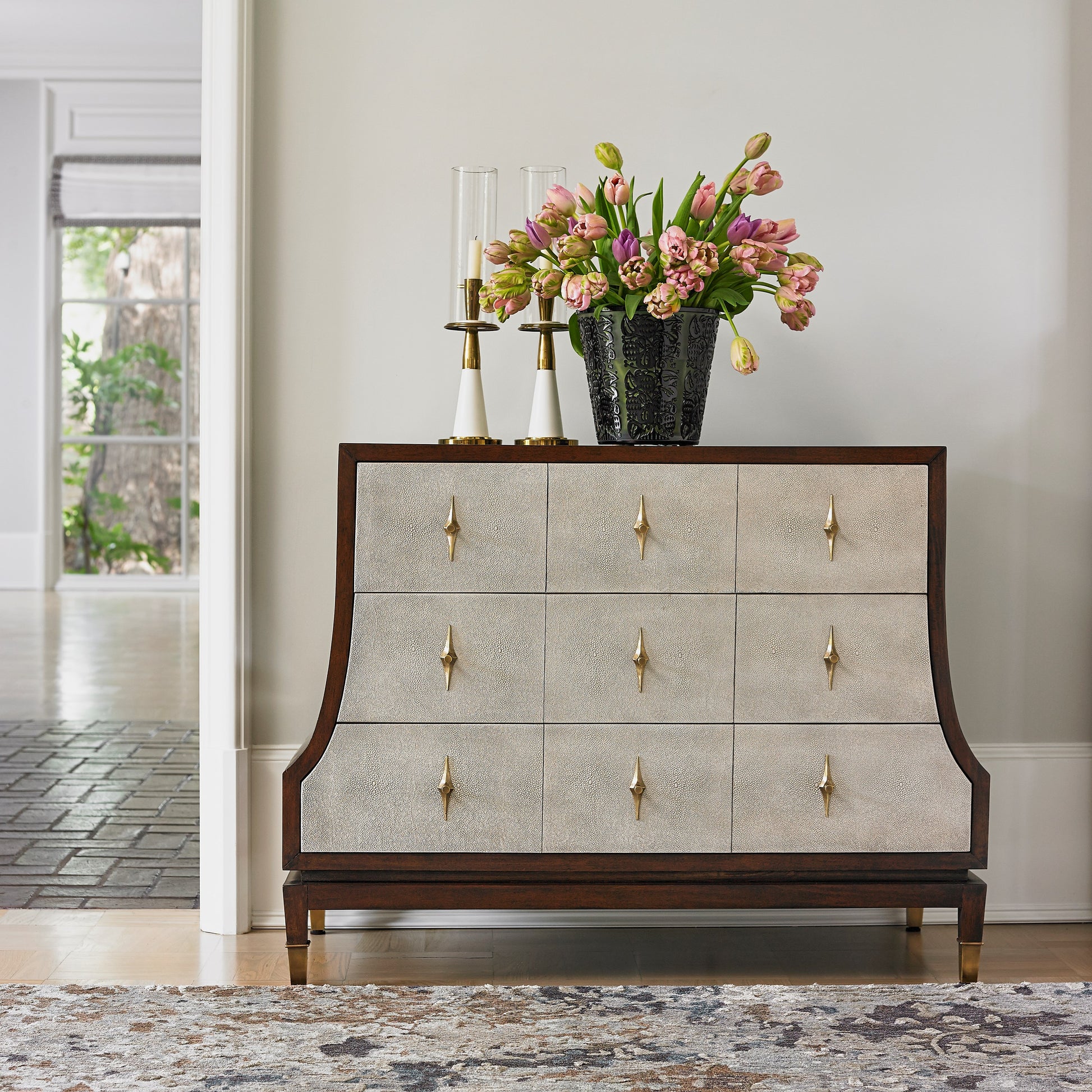 Stylish chest is made of solid mahogany and walnut veneer with a walnut color finish. Features faux Shagreen wrapped drawers and chic natural finish solid brass pulls with diamond shaped back plates. Feet have solid brass accents. Three oversized drawers have full extension soft close metal glides.