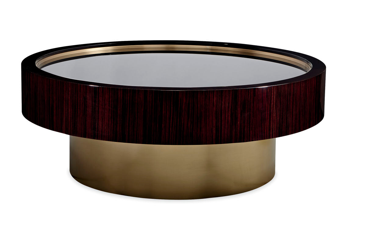 Looking for a distinctive cocktail table to add a warm yet modern focal point? Look no further, the Anonymous Cocktail table's striking circular shape and modern mix of materials promises to create a memorable, modern centerpiece while adding interesting layers of texture. We particularly love the contrast between the softness of the Urban Brass and the linear woodgrain of the Ebony Macassar. This unique table's surface is rendered in a reflective black glass and artfully rimmed in Urban Brass-creating a rich, lustrous look. To create an interesting juxtaposition of shapes perfect for larger spaces, pair the bold circular-shaped Anonymous Cocktail table with the oblong-shaped Flow Cocktail table.