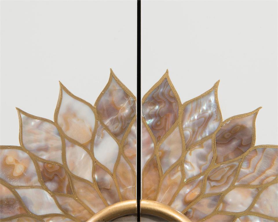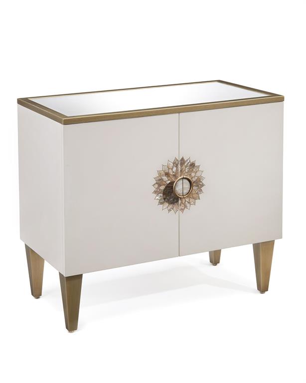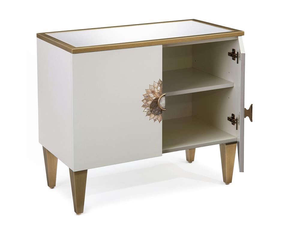 Finished in alabaster, this two-door side cabinet has one adjustable shelf and a central mother-of-pearl inlay with gold detailing that is reflected in the handles. The top has an inset modern mirror.
